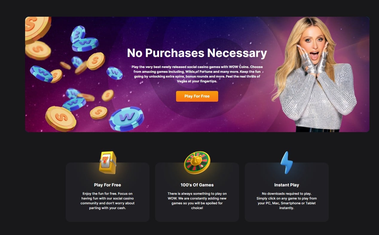 Like similar casino platforms, WOW Vegas offers free gameplay on the website using virtual currencies: Sweepstakes Coins (SC) and WOW Coins. The latter are strictly for gameplay with no monetary value at all.
